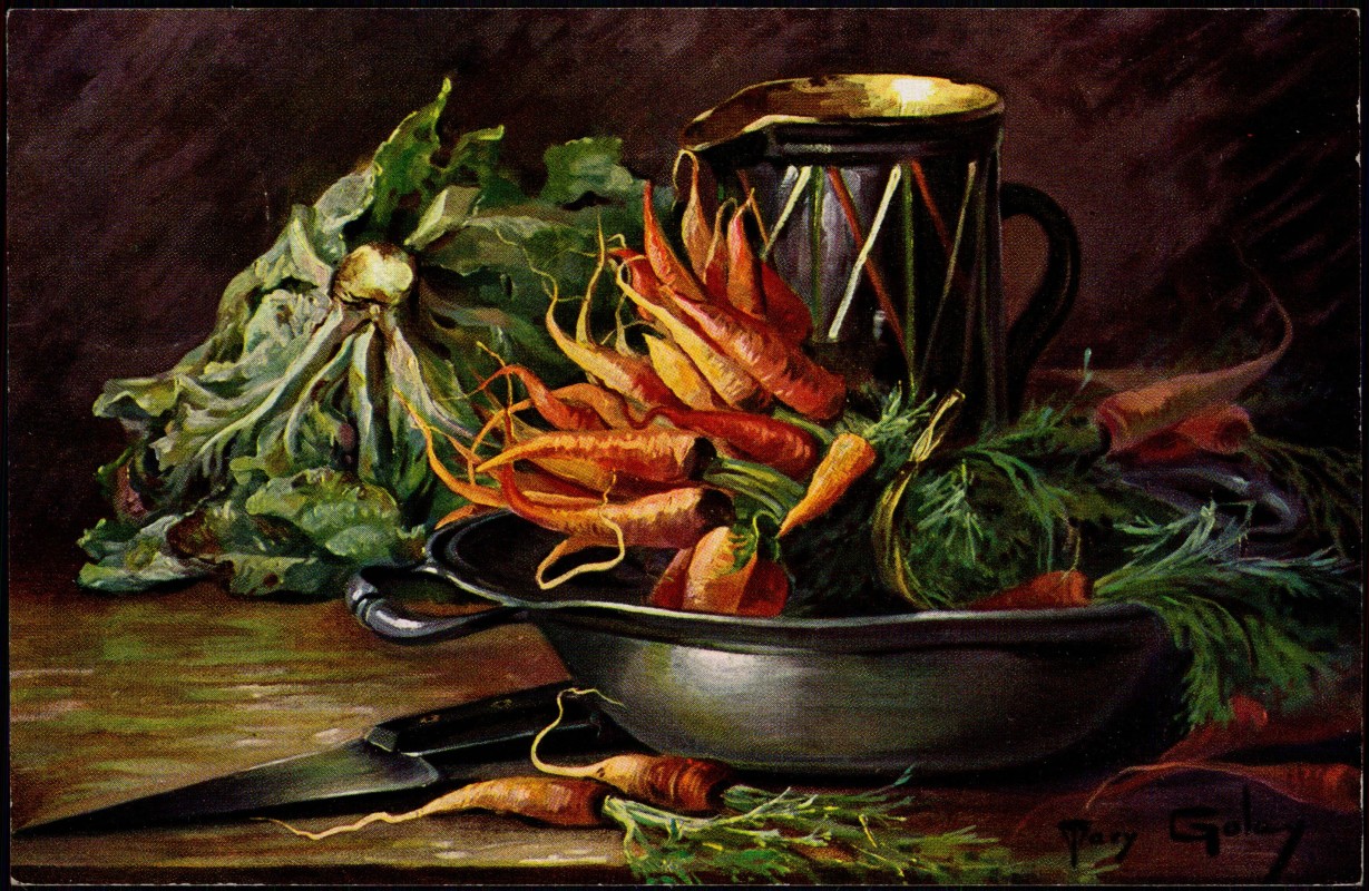 Ansichtskarte: Künstlerkarte Stillleben Tongeschirr Karotten Salat