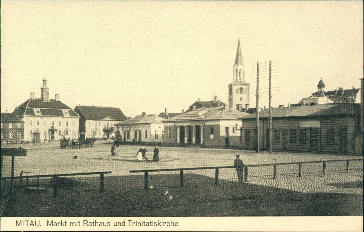 Ansichtskarte: Markt mit Rathaus und Trinitatiskirche - Mitau