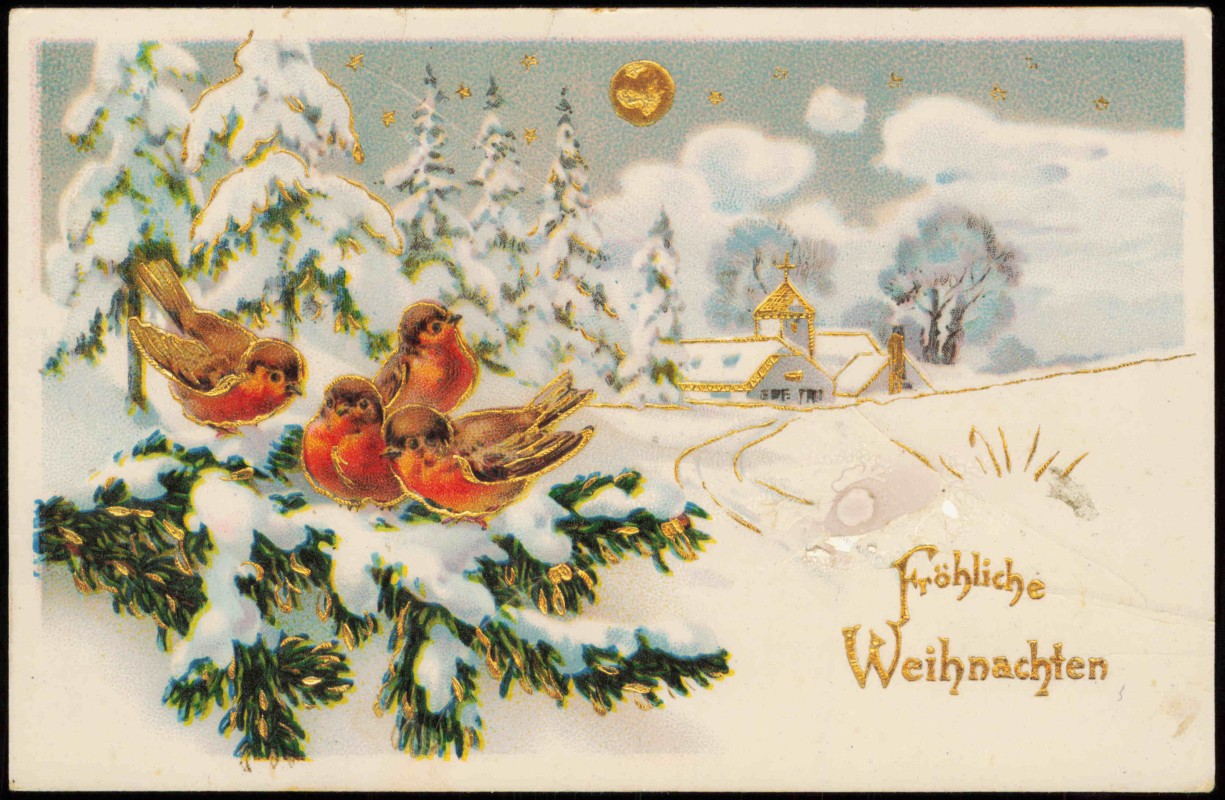 - Weihnachten Christmas Spatzen auf Tannenzweig Kirche Präge