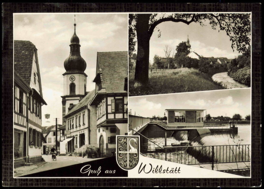 - Mehransichten der Gemeinde Willstätt. Linkes Bild zeigt eine Dorfstraße mit Fachwerkhäusern und einem Kirchturm mit Uhr. Oberes rechtes Bild zeigt einen Flusslauf mit Bäumen und einem Gebäude im Hintergrund. Unteres rechtes Bild zeigt ein Wehr oder eine Staustufe mit einem Gebäude am Flussufer.