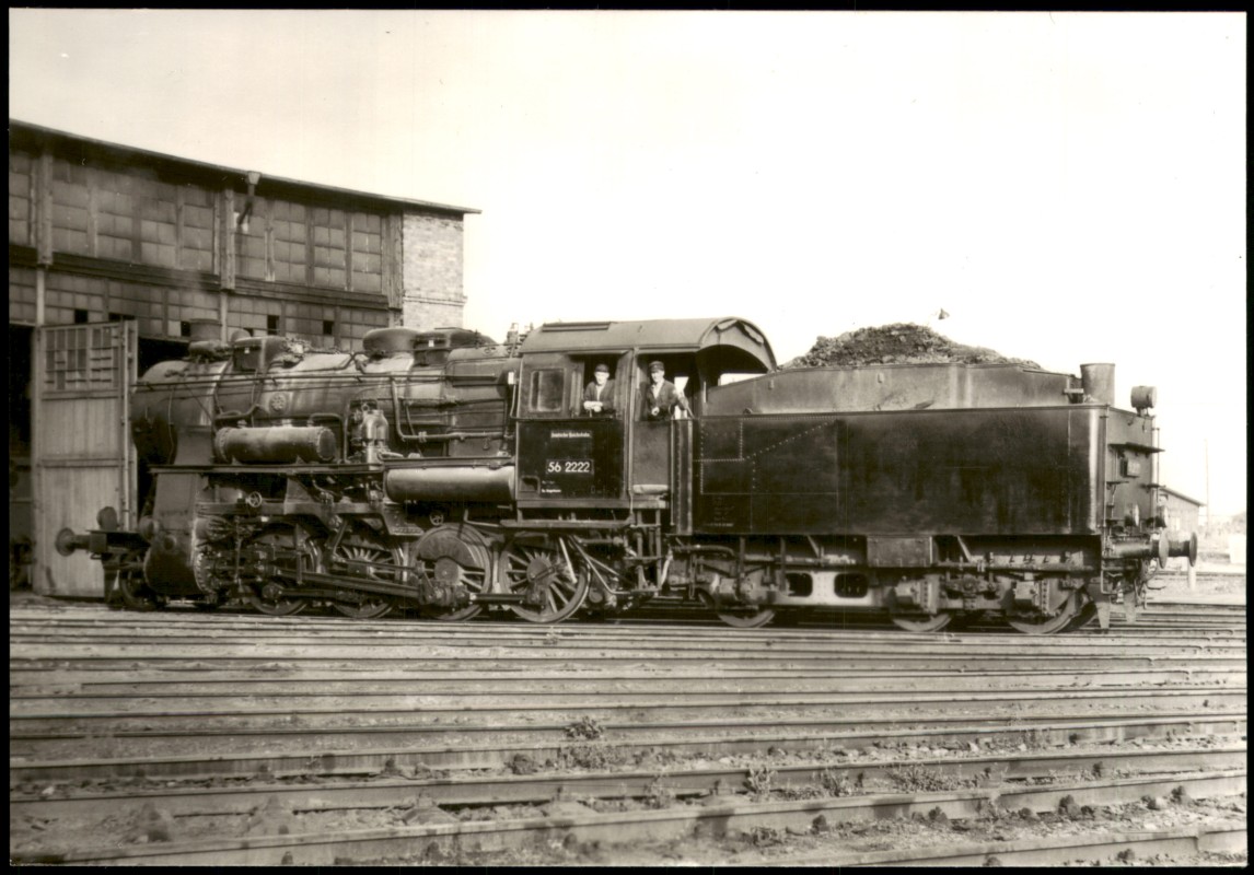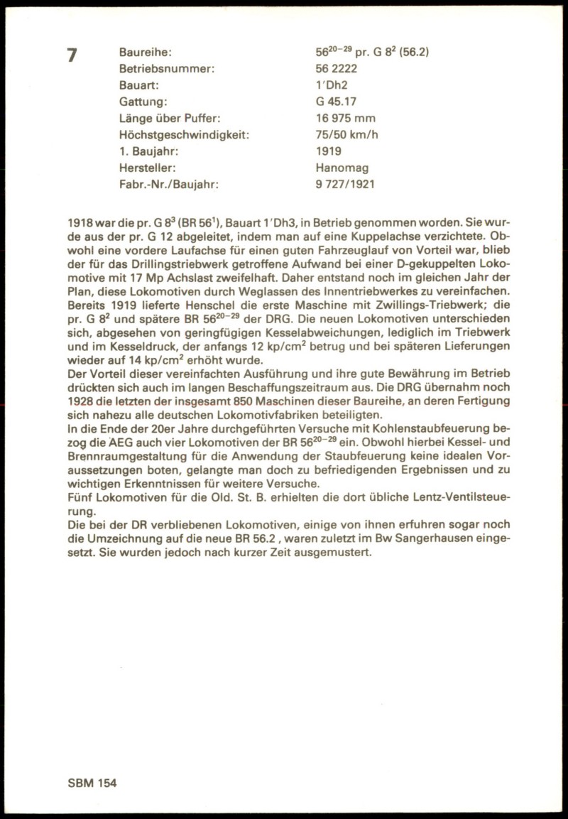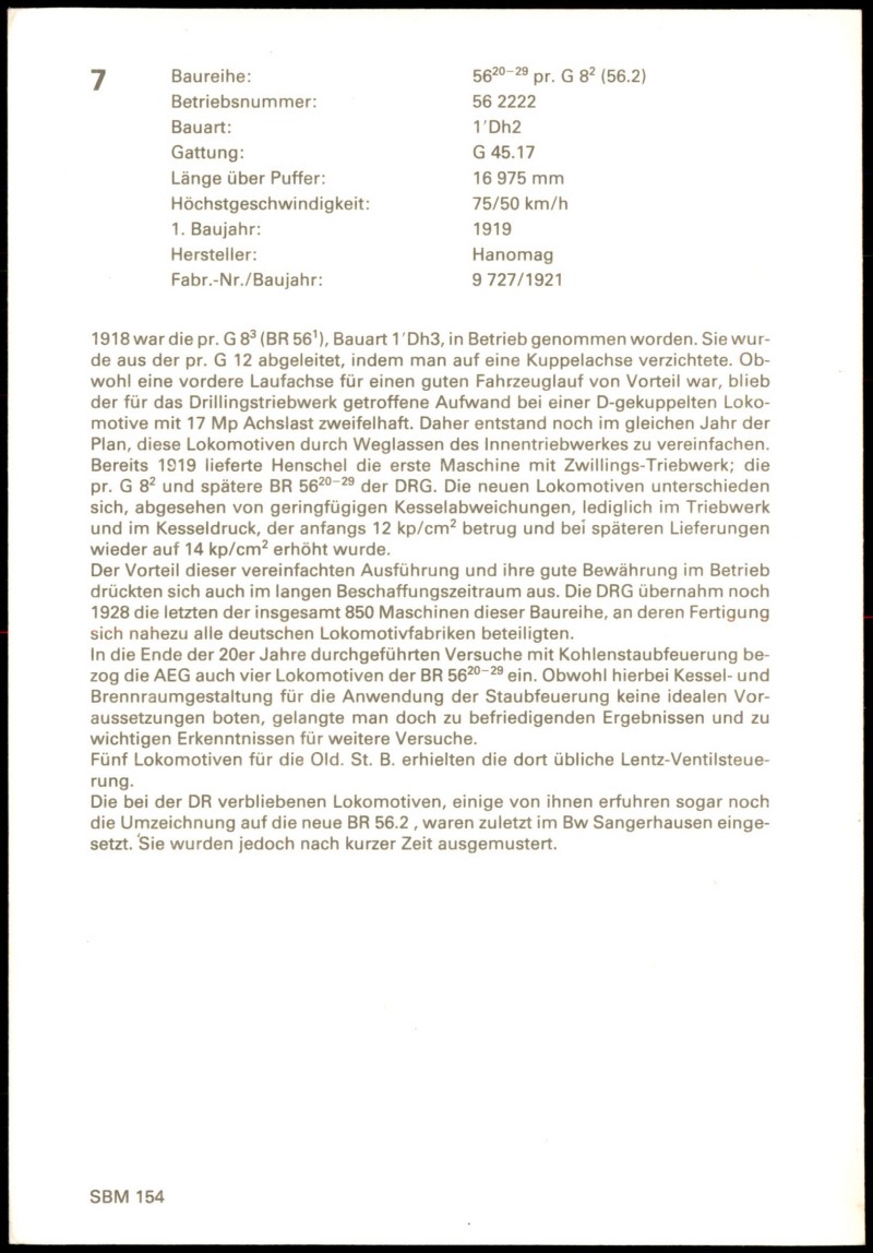 - Dampflokomotive der Baureihe 56.20-29 (ehemals preußische G 8²) mit der Betriebsnummer 56 2222. Die Lokomotive hat die Bauart 1'Dh2 und Gattung G 45.17. Ihre Länge über Puffer beträgt 16,975 m und die Höchstgeschwindigkeit 75/50 km/h. Das erste Baujahr war 1919, hergestellt von Hanomag mit der Fabriknummer 9727/1921. Die Baureihe wurde aus der pr. G 12 abgeleitet und war eine Vereinfachung der pr. G 8³ (BR 56.1). Bereits 1919 lieferte Henschel die erste Maschine mit Zwillings-Triebwerk. Die DRG übernahm bis 1928 insgesamt 850 Maschinen dieser Baureihe, an deren Fertigung sich nahezu alle deutschen Lokomotivfabriken beteiligten. Einige Lokomotiven wurden Ende der 1920er Jahre für Versuche mit Kohlenstaubfeuerung eingesetzt. Fünf Lokomotiven für die Old. St. B. erhielten eine Lentz-Ventilsteuerung. Die bei der DR verbliebenen Lokomotiven, einige davon als BR 56.2 umgezeichnet, waren zuletzt im Bw Sangerhausen stationiert, wurden aber kurz darauf ausgemustert. Verlag: SBM, Seriennummer: 154.