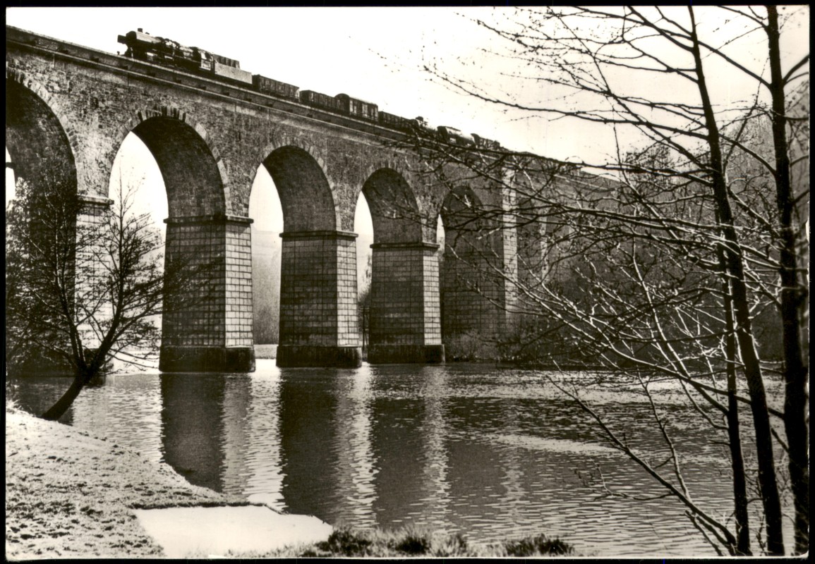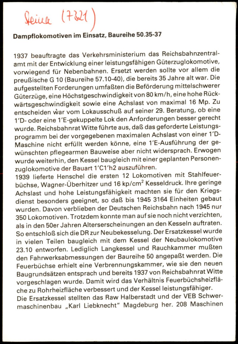 - Die Postkarte zeigt Dampflokomotiven der Baureihe 50.35-37 auf einem imposanten Eisenbahnviadukt, der über ein Gewässer führt. Die Baureihe 50 wurde 1937 vom Verkehrsministerium als leistungsfähige Güterzuglokomotive für Nebenbahnen in Auftrag gegeben, um die preußische G 10 (Baureihe 57.10-40) zu ersetzen. Die aufgestellten Forderungen umfassten die Beförderung mittelschwerer Güterzüge, eine Höchstgeschwindigkeit von 80 km/h, eine hohe Rückwärtsgeschwindigkeit sowie eine Achslast von maximal 16 Mp. 1939 lieferte Henschel die ersten 12 Lokomotiven mit Stahlfeuerbüchse, Wagner-Überhitzer und 16 kp/cm² Kesseldruck. Ihre geringe Achslast und hohe Leistungsfähigkeit machten sie für den Kriegsdienst besonders geeignet, so dass bis 1945 3164 Einheiten gebaut wurden. Nach 1945 verblieben der Deutschen Reichsbahn nur 350 Lokomotiven. In den 1950er Jahren entschloss sich die DR zur Neubekesselung aufgrund von Alterserscheinungen an den Kesseln. Der Ersatzkessel wurde in vielen Teilen baugleich mit dem Kessel der Neubaulokomotive 23.10 entworfen, wobei Langkessel und Rauchkammer an die Fahrwerksabmessungen der Baureihe 50 angepasst wurden. Die Feuerbüchse erhielt eine Verbrennungskammer, wie sie bereits 1937 von Reichsbahnrat Witte vorgeschlagen wurde, um das Verhältnis Feuerbüchsheizfläche zu Rohrheizfläche zu verbessern und den Kessel leistungsfähiger zu machen. Die Ersatzkessel wurden vom Raw Halberstadt und dem VEB Schwermaschinenbau „Karl Liebknecht“ Magdeburg hergestellt. Die abgebildeten Lokomotiven sind spezifisch die Baureihe 50.35-37, welche die neu bekesselten Varianten der Baureihe 50 sind. Verlag 'Seina', Seriennummer 17321.