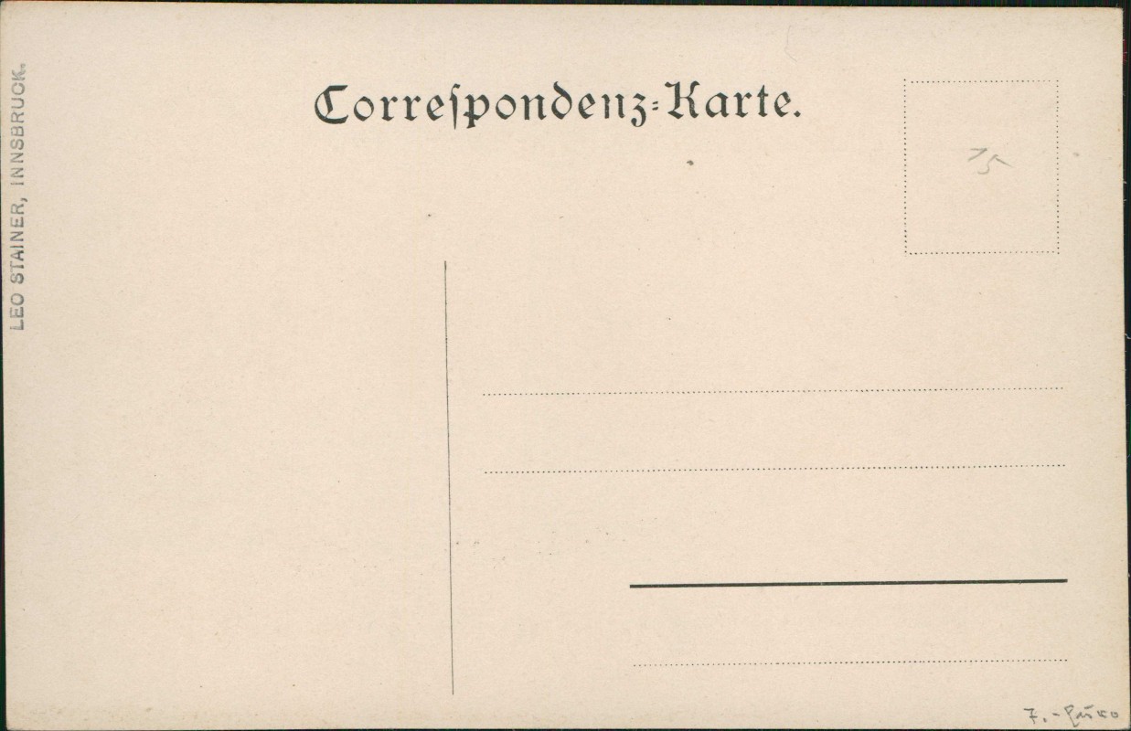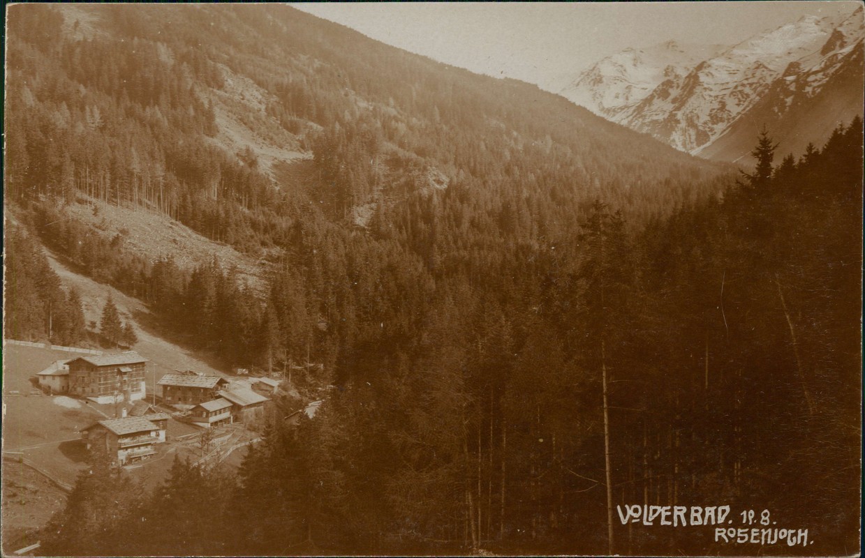 - Historische Ansicht des Volder Bades, einer kleinen Siedlung in einem bewaldeten Tal, mit den schneebedeckten Gipfeln des Rosenjochs im Hintergrund. Die Karte wurde von Leo Stainer in Innsbruck herausgegeben.