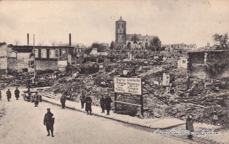 Ansichtskarte: Soldaten, Blick auf die zerstörte Stadt -Wegweiser - Rethel