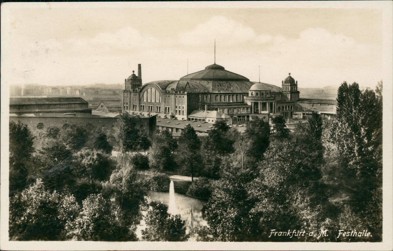 Ansichtskarte: Blick über den Park auf die Festhalle - Frankfurt am Main
