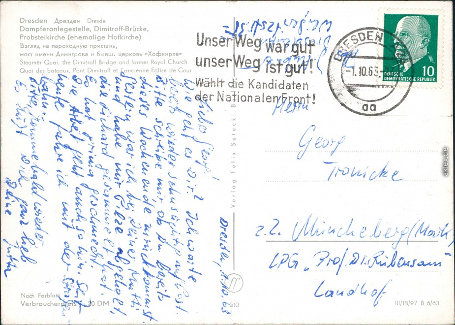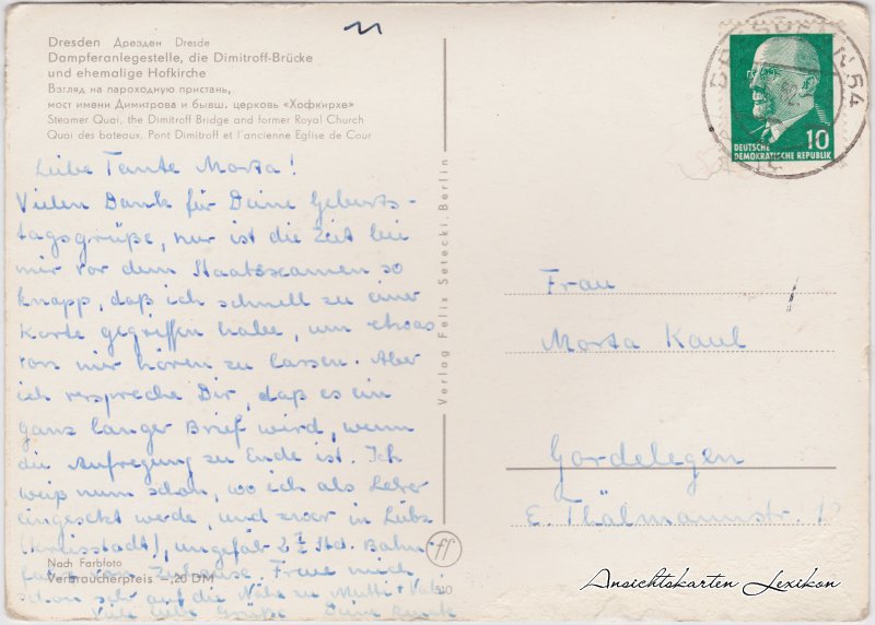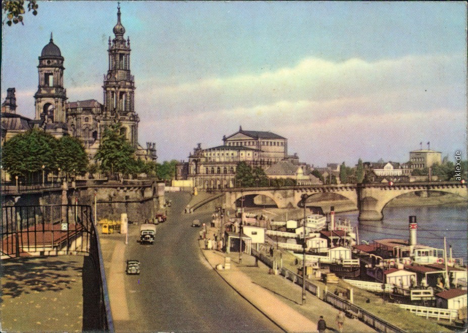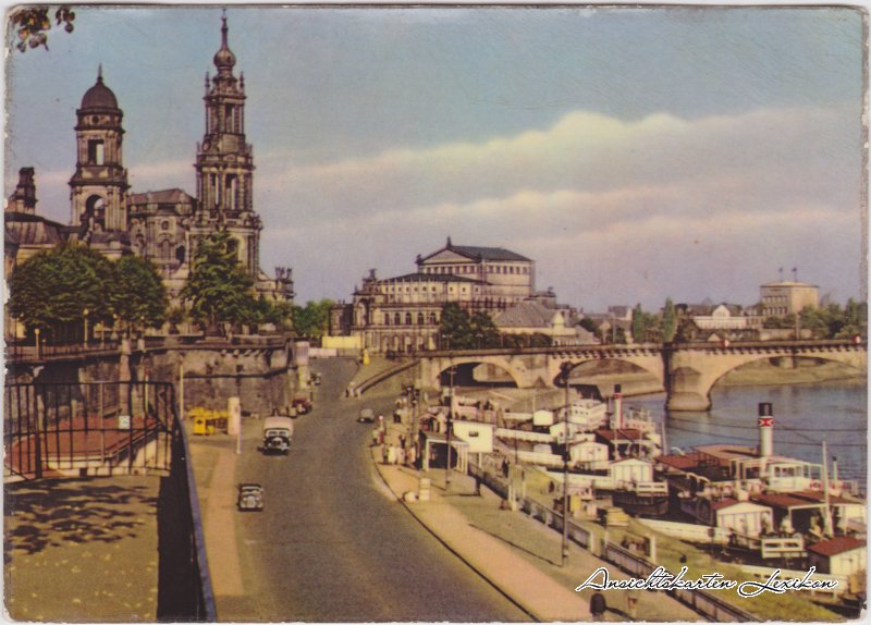 Ansichtskarte: Dampferanlegestelle, die Dimitroff-Brücke und ehemalige Hofkirche - Innere Altstadt-Dresden