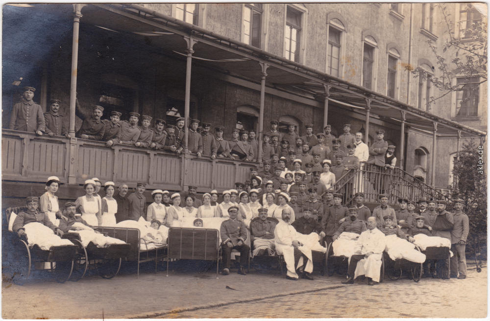 - Soldaten in Rollstühlen und Betten vor dem Lazarett