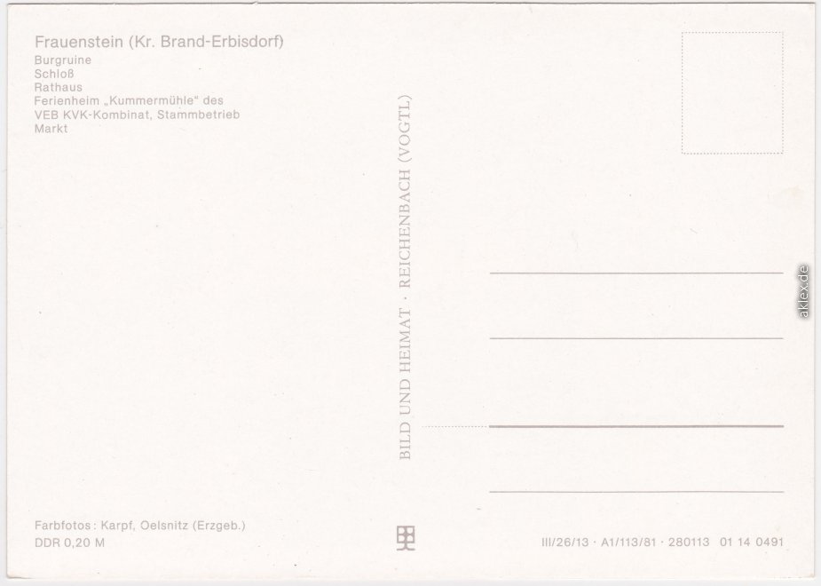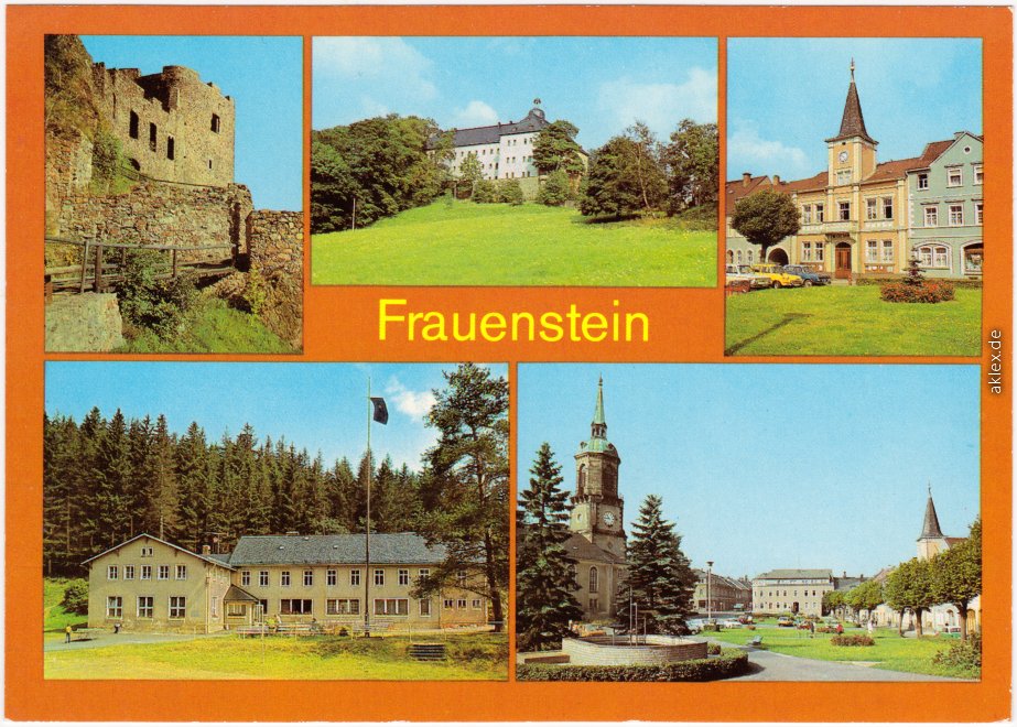 Ansichtskarte: Burgruine, Schloß, Rathaus, Ferienheim "Kummermühle" des VEB KVK-Kombinat. Stammbetrieb, Markt - Frauenstein (Erzgebirge)