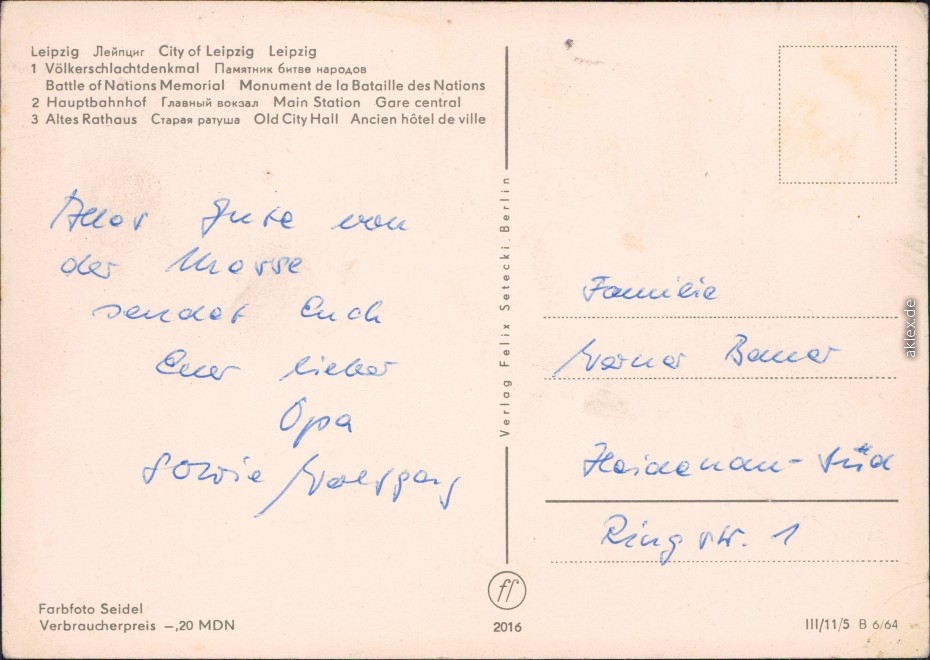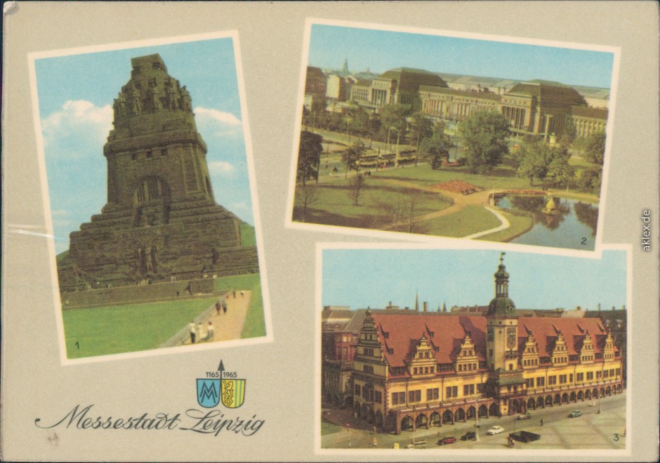 Ansichtskarte: 1 Völkerschlachtdenkmal, 2 Hauptbahnhof, 3 Altes Rathaus - Leipzig