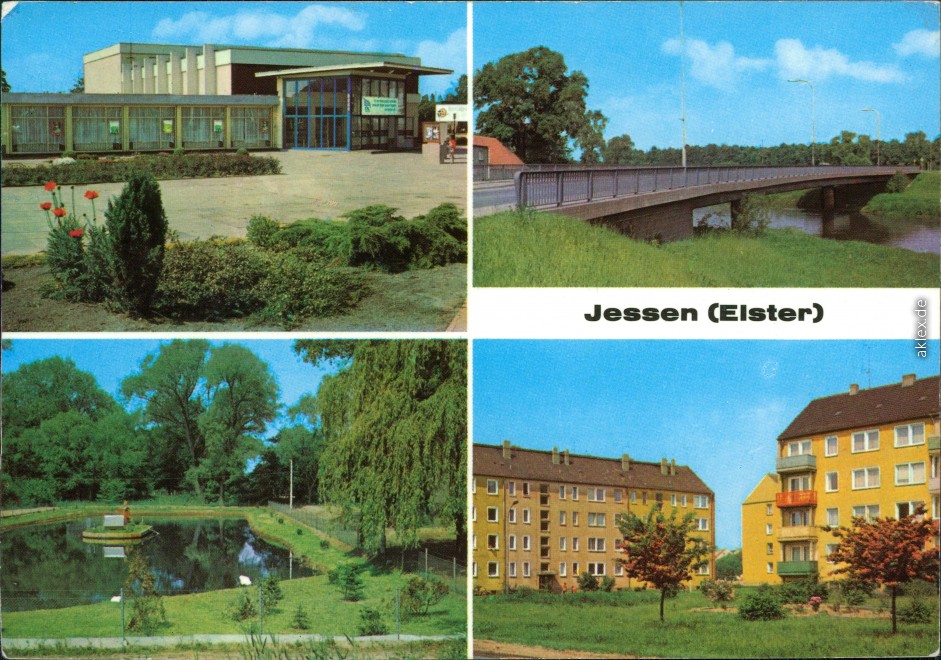 Ansichtskarte: Kulturhaus, Friedensbrücke, Parkanlage, Heinrich-Rau-Straße - Jessen