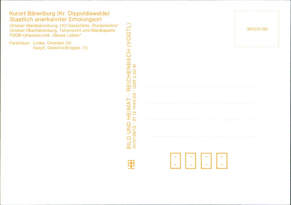 - Ortsteil Waldbärenburg - HO-Gaststätte "Riedelmühle", Ortsteil Oberbärenburg - Teilansicht und Waldkapelle, FDGB-Urlaubercafé "Neues Leben"