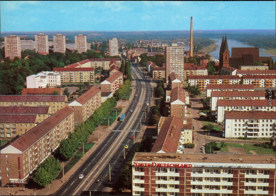 - Blick vom Hochhaus zur Karl-Marx-Straße mit Kirche und Großen Schornstein im Hintergrund