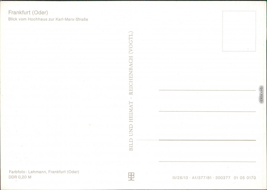 Ansichtskarte: Blick vom Hochhaus zur Karl-Marx-Straße mit Kirche und Großen Schornstein im Hintergrund - Frankfurt (Oder)