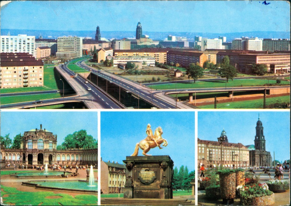 Ansichtskarte: Blick auf Altstadt, Wallpavillon im Zwinger, Goldener Reiter, Kreuzkirche - Dresden